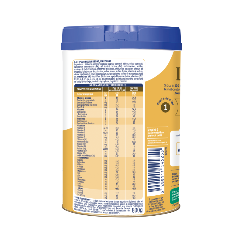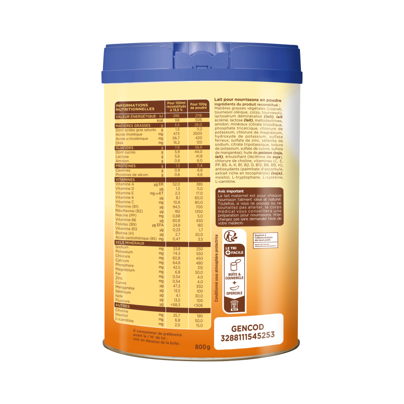 Matières grasses végétales (coprah, tournesol oléique, colza, tournesol), lactosérum déminéralisé (lait), lait écrémé, lactose (lait), maltodextrines, amidon, minéraux (citrate trisodique, phosphate tricalcique, chlorure de potassium, chlorure de magnésium, hydroxyde de potassium, sulfate ferreux, sulfate de zinc, sélénite de sodium, citrate tripotassique, iodure de potassium, sulfate de cuivre, sulfate de manganèse), huile de poisson (soja, lait), émulsifiant (lécithine de soja), chlorure de choline, vitamines (C, E, PP, B5, A, K, B1, B2, D, B12, B6, B9, H), antioxydants (palmitate d'ascorbyle, extrait riche en tocophérols) (soja), inositol, L-tryptophane, L-cystéine, L-carnitine.