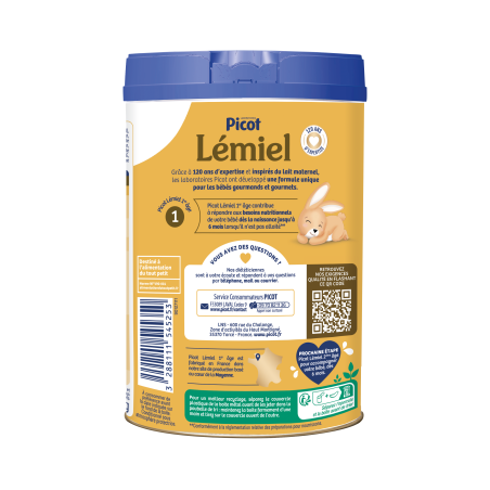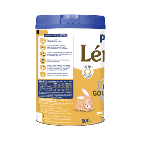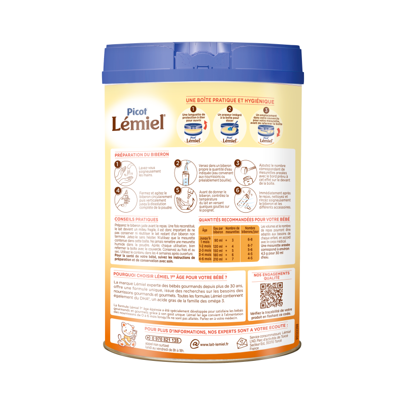 Préparez le biberon juste avant le repas. Une fois reconstitué,le lait devient un milieu fragile, il est donc important de ne pas conserver ni réutiliser le lait restant d’un biberon non terminé. Jetez-le sans hésiter. N’utilisez que la mesurette contenue dans cette boîte. Ne jamais remettre une mesurette humide dans la poudre. Après chaque utilisation, bien refermer la boîte avec le couvercle. Conservez au frais et au sec. Utilisez le contenu dans les 4 semaines après ouverture. Pour la santé de votre bébé, suivez les instructions de préparation et de conservation avec soin.