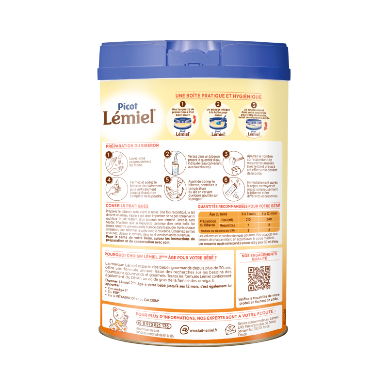 Préparez le biberon juste avant le repas. Une fois reconstitué,le lait devient un milieu fragile, il est donc important de ne pas conserver ni réutiliser le lait restant d’un biberon non terminé. Jetez-le sans hésiter. N’utilisez que la mesurette contenue dans cette boîte. Ne jamais remettre une mesurette humide dans la poudre. Après chaque utilisation, bien refermer la boîte avec le couvercle. Conservez au frais et au sec. Utilisez le contenu dans les 4 semaines après ouverture. Pour la santé de votre bébé, suivez les instructions de préparation et de conservation avec soin.