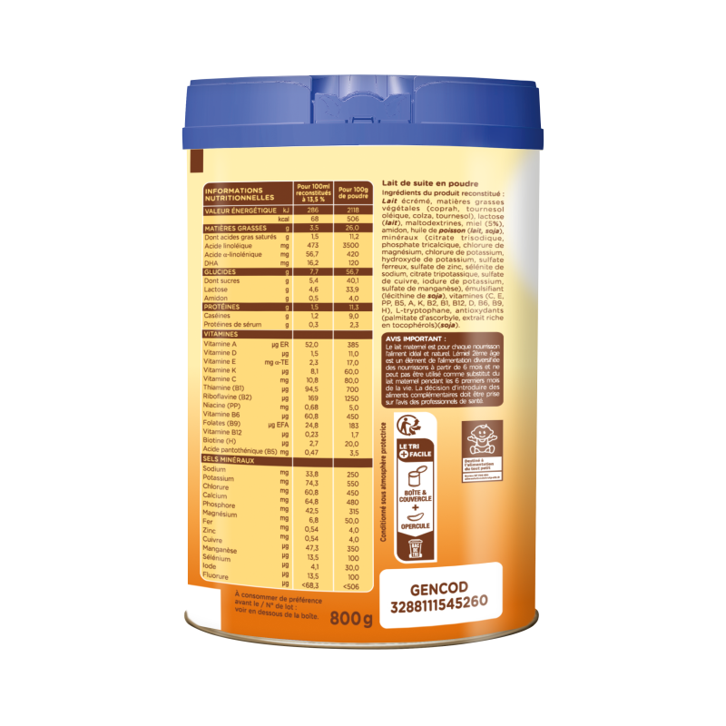 Lait écrémé, matières grasses végétales (coprah, tournesol oléique, colza, tournesol), lactose (lait), maltodextrines, miel (5%), amidon, huile de poisson (lait, soja), minéraux (citrate trisodique, phosphate tricalcique, chlorure de magnésium, chlorure de potassium, hydroxyde de potassium, sulfate ferreux, sulfate de zinc, sélénite de sodium, citrate tripotassique, sulfate de cuivre, iodure de potassium, sulfate de manganèse), émulsifiant (lécithine de soja), vitamines (C, E, PP, B5, A, K, B2, B1, B12, D, B6, B9, H), L-tryptophane, antioxydants (palmitate d'ascorbyle, extrait riche en tocophérols)(soja).